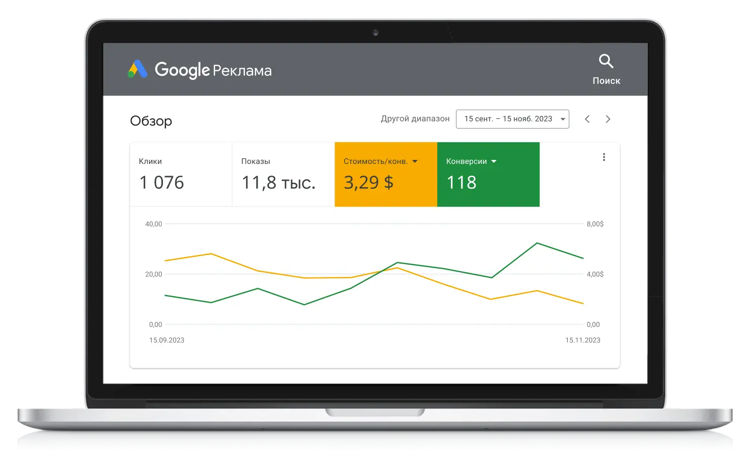 После запуска поисковых кампаний мы начали регулярно отслеживать ключевые метрики — стоимость клика, конверсии и поведение пользователей на лендинге. На основе полученных данных корректировали тексты объявлений, добавляли новые ключевые фразы и перераспределяли бюджеты между группами объявлений.
