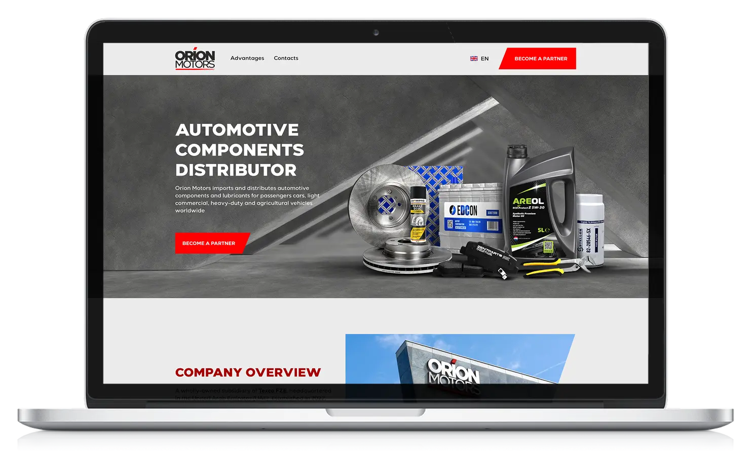 Необходимо было разработать лендинг, который презентует Orion Motors как надёжного дистрибьютора автокомпонентов на глобальном рынке. Задача — лаконично представить направления поставок, выделить ассортимент и преимущества, а также встроить форму обратной связи для потенциальных партнёров. Сайт должен быть современным, адаптивным и готовым к международному использованию с возможностью масштабирования.