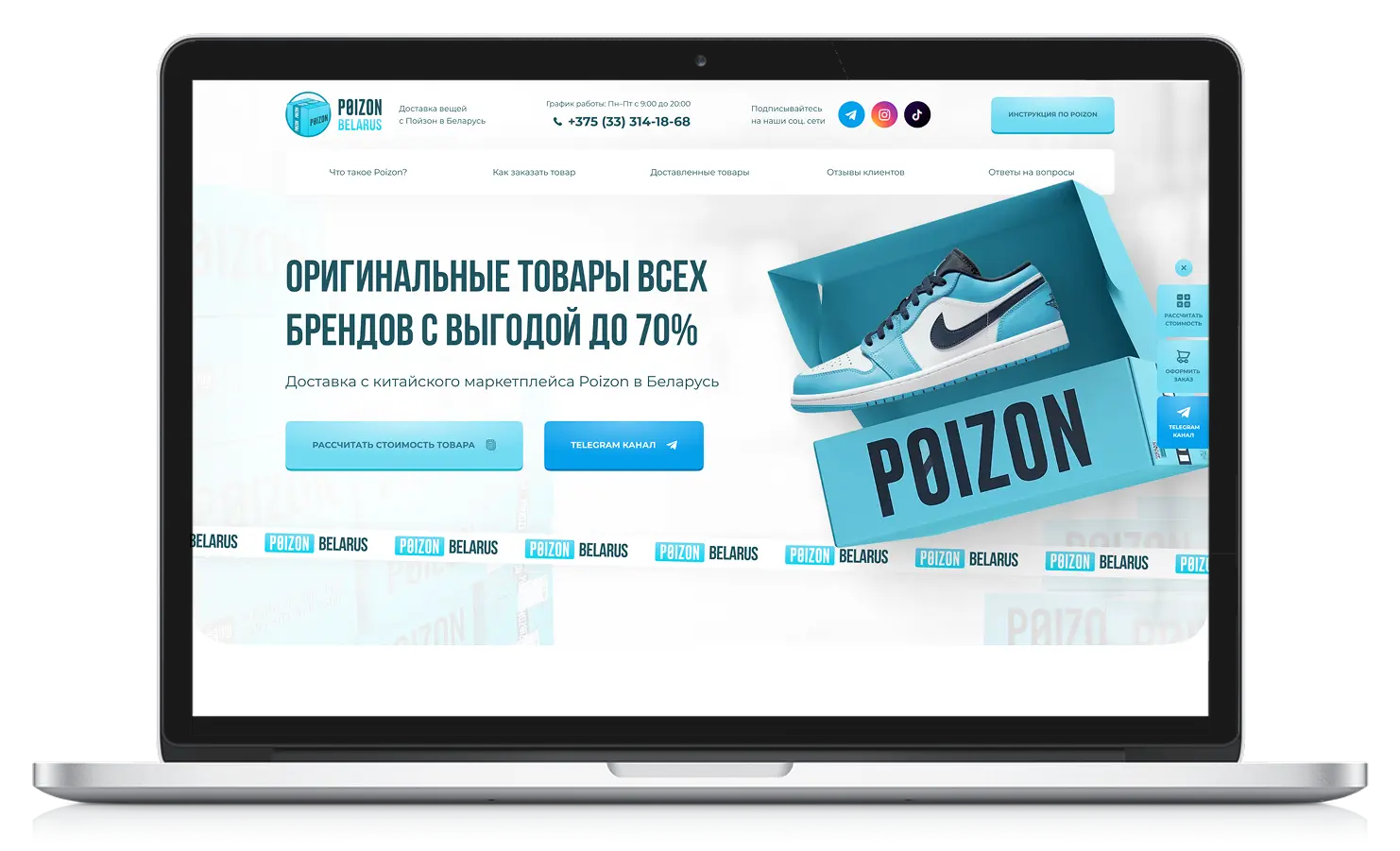 Клиент уже успешно принимал заказы через телеграм-канал, но решил выйти за пределы мессенджера, чтобы расширить охват и привлекать новых клиентов через поисковые системы. Основной задачей было разработать лендинг, который чётко объясняет, как работает доставка с Poizon, закрывает основные возражения и стимулирует оставить заявку. Важно было продумать структуру под SEO, оформить блоки с преимуществами, тарифами, пошаговой инструкцией и отзывами.