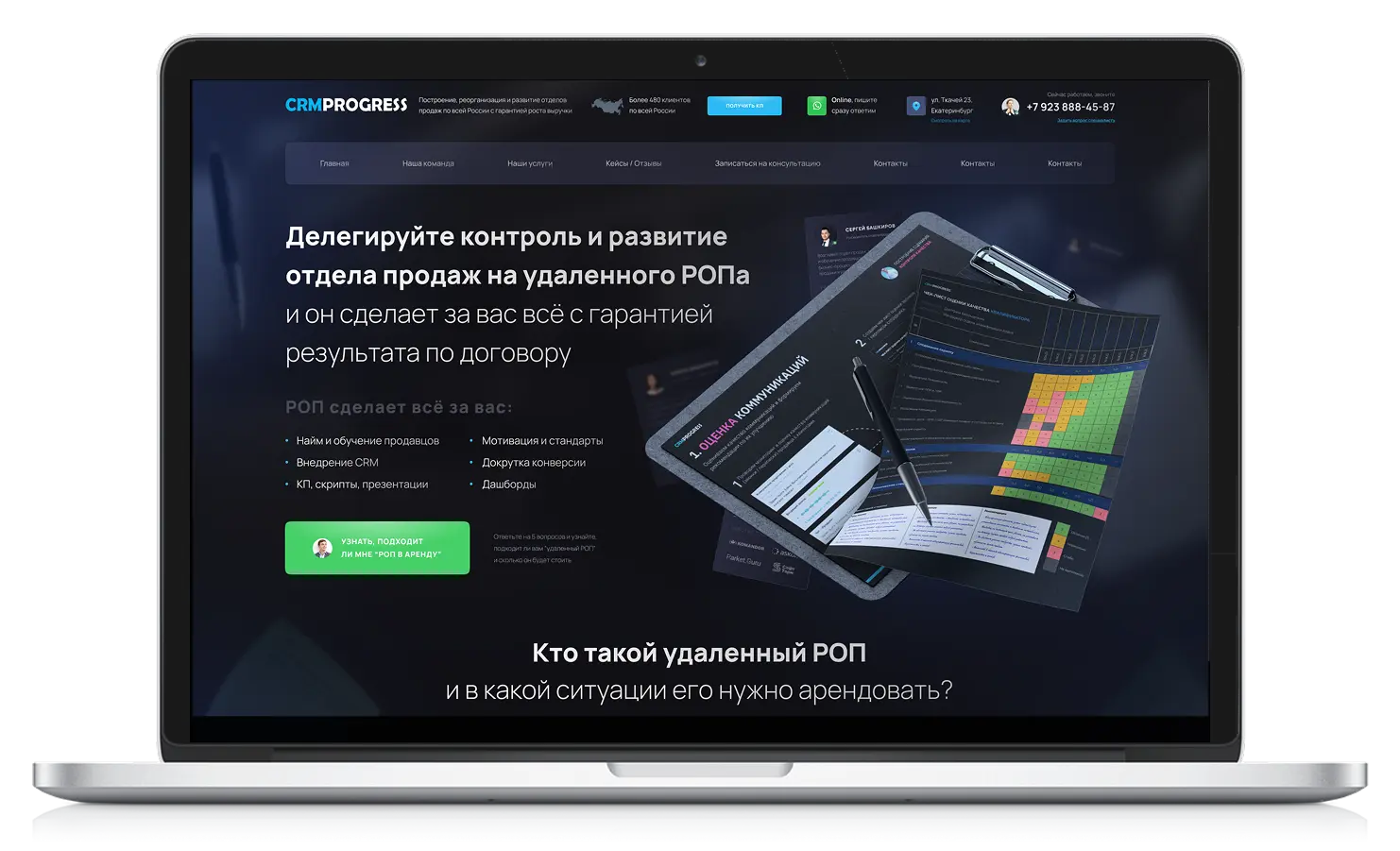 У клиента уже есть основной сайт по услугам автоматизации и внедрению CRM, и теперь было важно презентовать новую точечную услугу — аренда удалённого руководителя отдела продаж (РОПа). Задача — создать лендинг, который чётко доносит суть предложения, выгоды для бизнеса, сценарии применения и цену услуги. При этом лендинг должен визуально отличаться от основного сайта, быть фокусным, адаптивным и заточенным под конверсию.