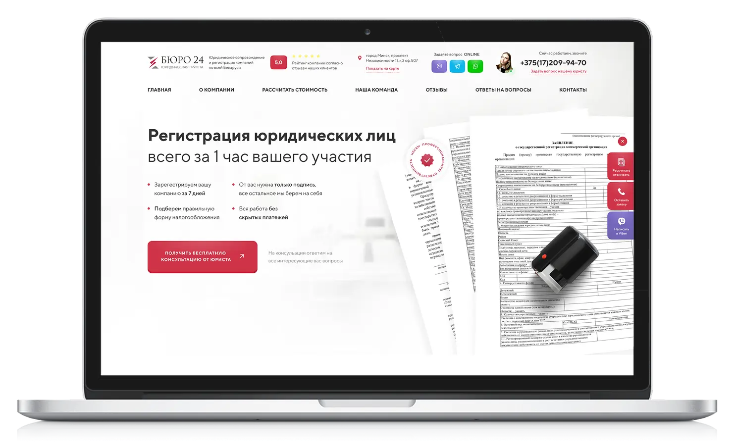 Сделали лендинг простым, юридически грамотным и вовлекающим — чтобы пользователь без лишних вопросов понял, что нужно чтобы зарегистрировать компанию и сразу оставил заявку.