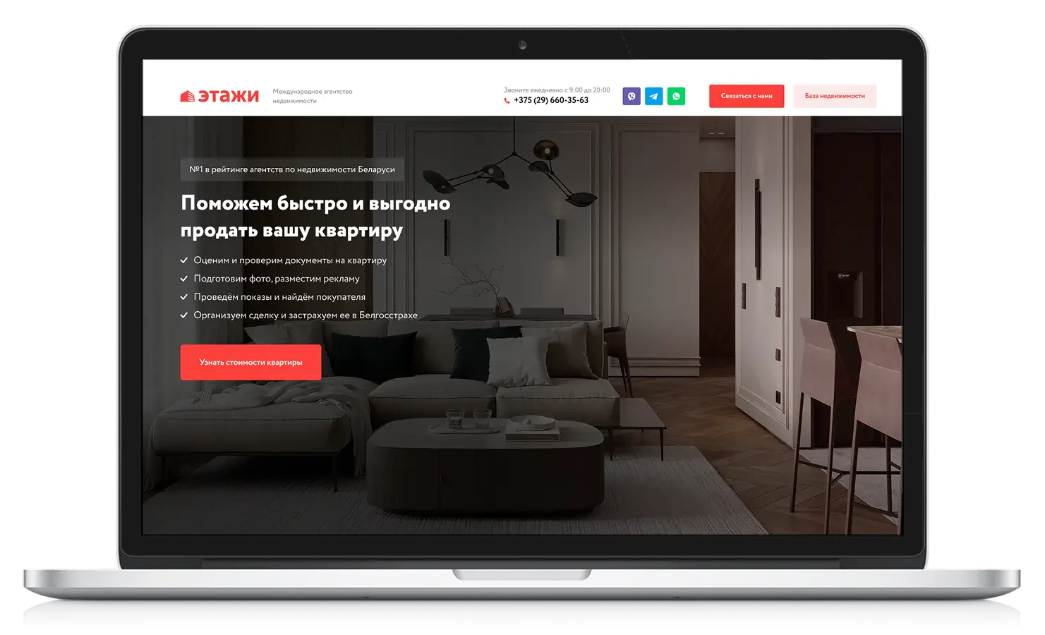 Выполнили комплексную разработку лендинга для агентства недвижимости «Этажи» с акцентом на конверсию рекламного трафика, доверие собственников и прозрачность процесса продажи. Проект стал эффективным инструментом привлечения заявок и усиления позиций компании на рынке недвижимости Беларуси.