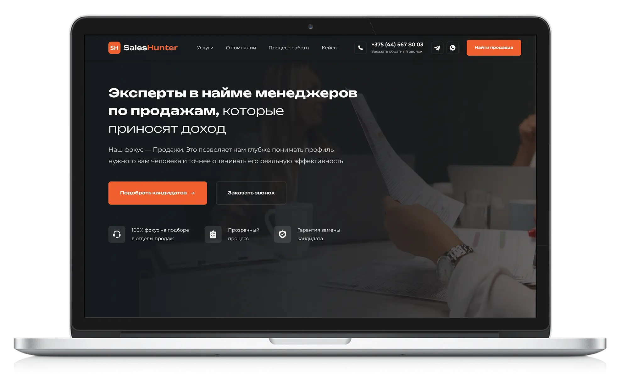 Для Sales Hunter был разработан современный продающий лендинг, который сразу доносит основную ценность компании — подбор менеджеров по продажам, способных приносить бизнесу реальный результат. Главный экран построен вокруг сильного заголовка и понятного оффера, который сразу объясняет, чем занимается агентство. Контрастные кнопки с призывом к действию помогают пользователю быстро перейти к подбору кандидатов или оставить заявку на консультацию.
