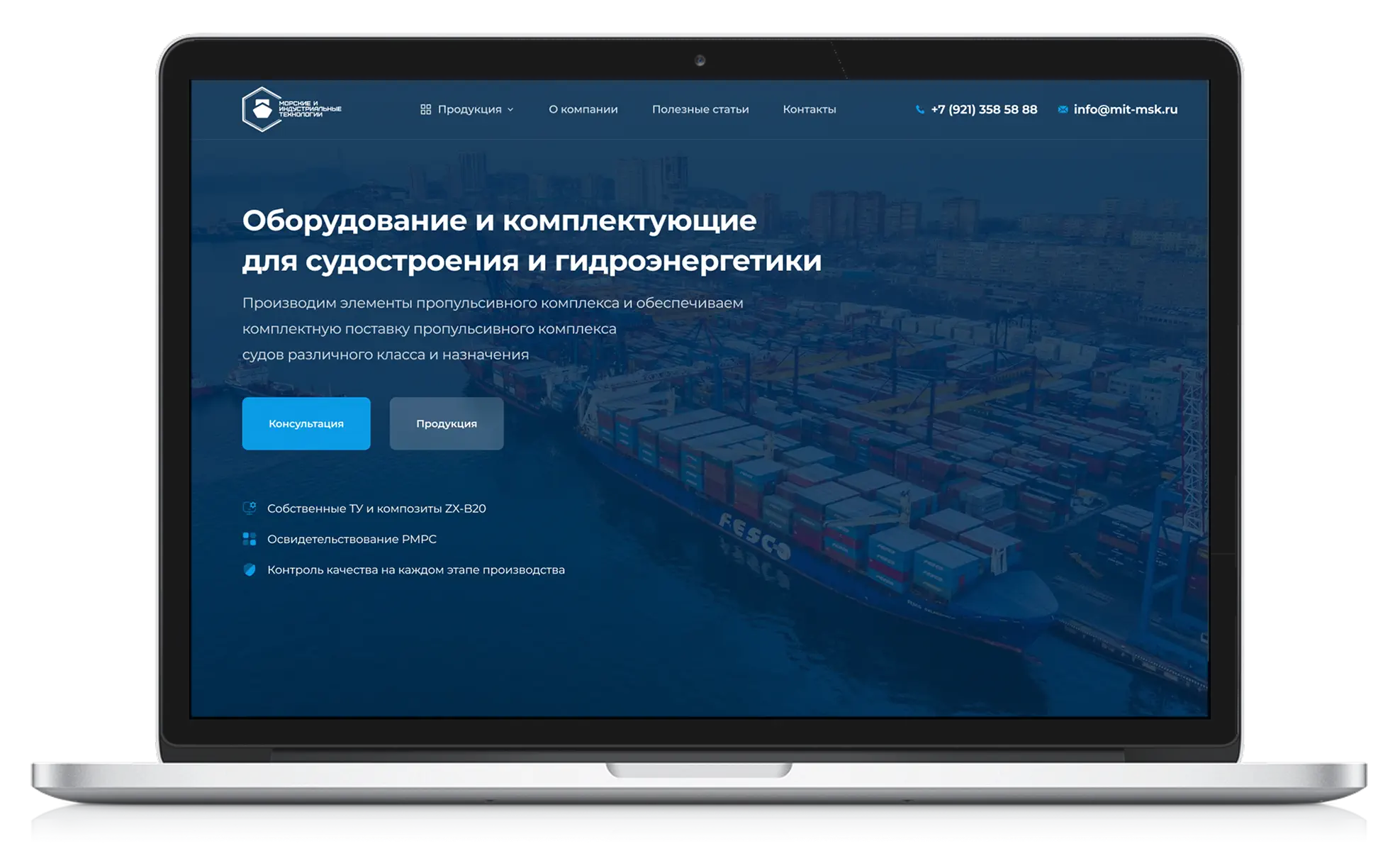 Для компании «МИТ» был разработан строгий корпоративный дизайн, отражающий инженерный профиль и промышленную специфику бизнеса. Визуальная концепция построена в холодной сине-графитовой палитре, ассоциирующейся с морской отраслью, надёжностью и технологичностью. В основе — крупные индустриальные изображения, чёткая типографика и аккуратная сетка. Первый экран формирует чёткое позиционирование: оборудование и комплектующие для судостроения и гидроэнергетики. Ниже — структурированная подача ключевых направлений продукции с акцентом на технические характеристики и стандарты качества. Такой подход подчёркивает экспертность и ориентированность на B2B-аудиторию.