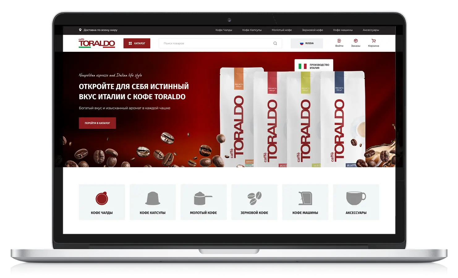 Создать современный интернет-магазин, который станет удобным инструментом для оптовых заказов кофе и представит бренд Toraldo онлайн. Важно было учесть B2B-специфику, отразить премиальность продукции и обеспечить простой процесс оформления заявки для партнёров и кафе.