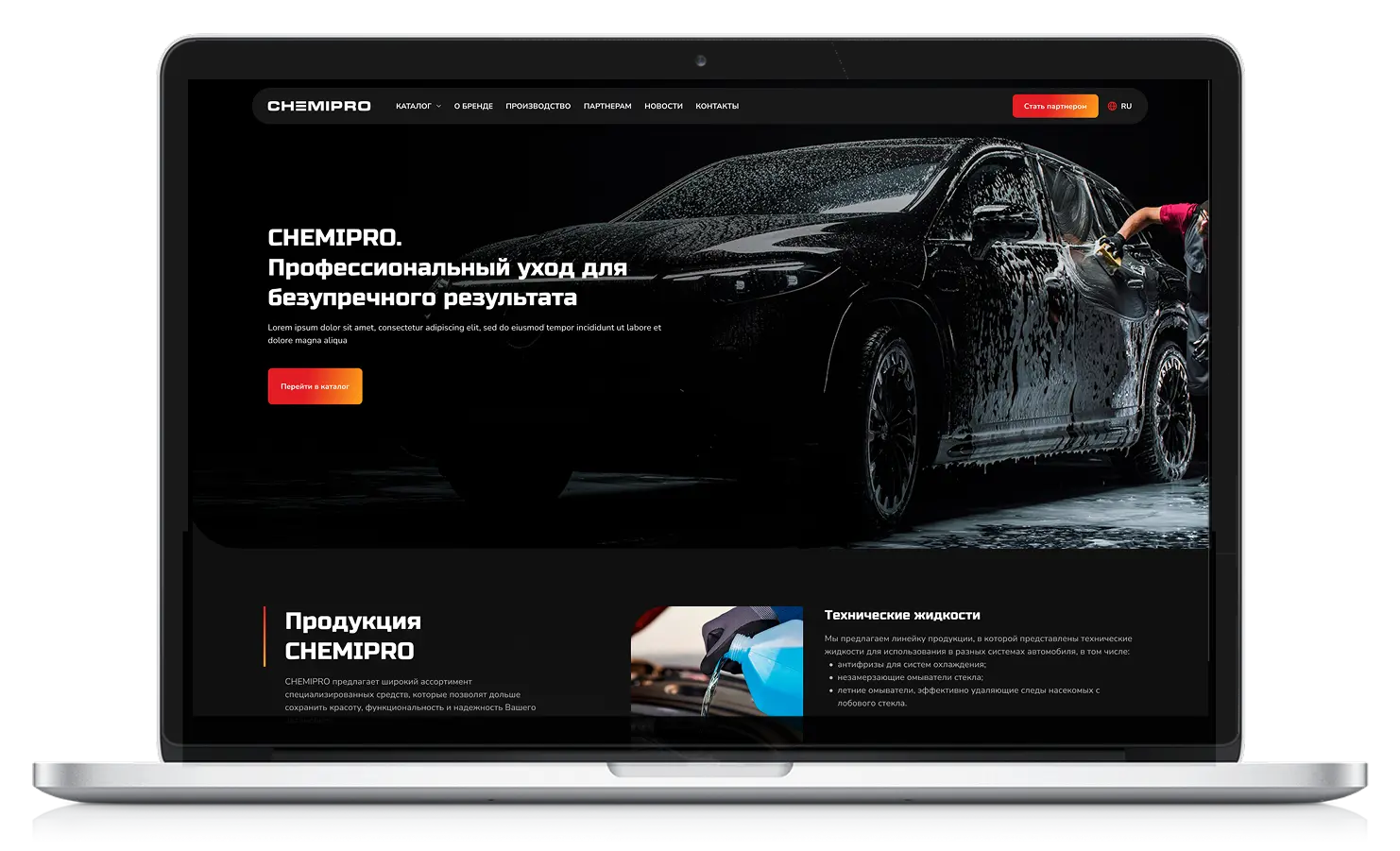 Клиенту требовался сайт-каталог для представления продукции бренда CHEMIPRO на международном рынке. Основной задачей было разработать современный, лаконичный и удобный сайт с фильтрацией по категориям, типу продукции и области применения. Сайт ориентирован на B2B-сегмент — дистрибьюторов, оптовиков и профессионалов отрасли.