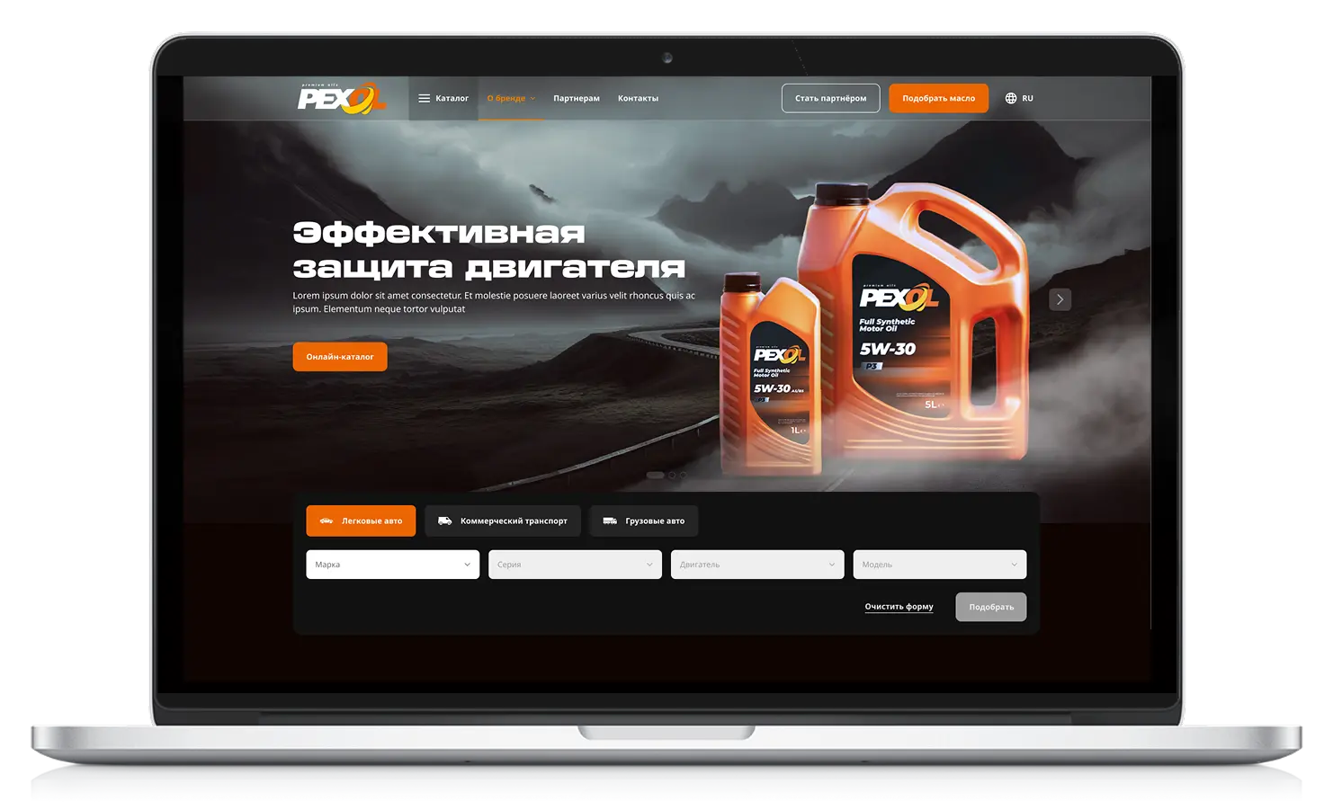 Сайт PEXOL разработан по блочной структуре с акцентом на технологичность, глубину цвета и визуальную динамику. Первый экран — яркая продуктовая презентация с мгновенным доступом к каталогу. Ниже расположен подборщик масел с пошаговым выбором параметров.